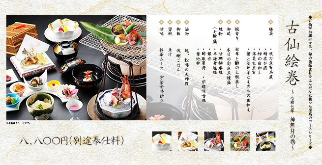 こちらは古仙がお届けする、旬の逸品素材をふんだんに使った至高のコースシリーズ、古仙絵巻です。色づく木の葉、深まる虫の音、一つひとつに感じ入る日本の秋の美しさ。その愛すべき移ろいの景色を、鮮やかに映しました。